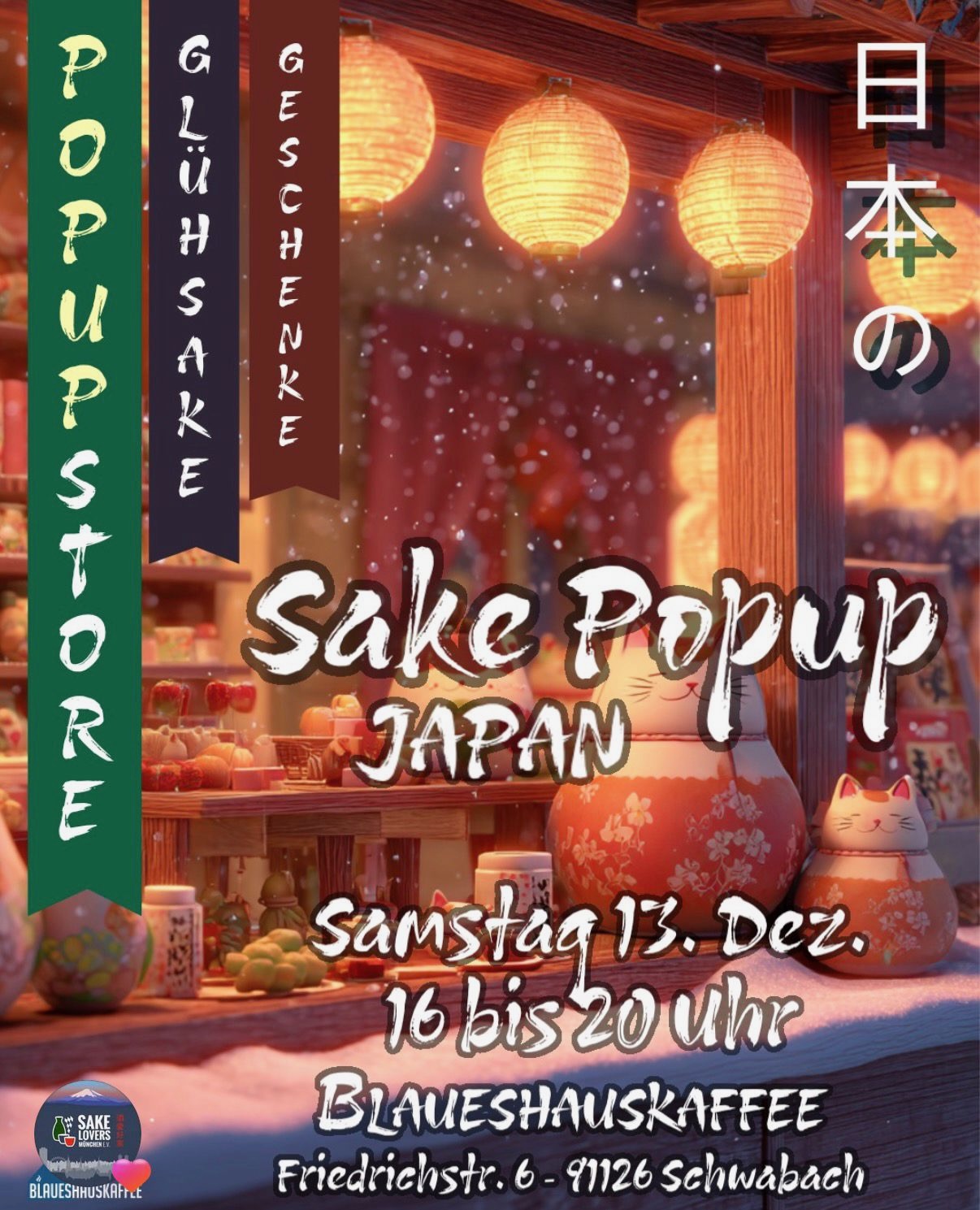 Am Samstag, den 13. Dezember habt ihr die Möglichkeit im Blaueshauskaffee ein ein wenig Japan in Franken zu erleben. Neben Sake und Glühsake gibt es japanische Geschenke zu "erforschen", die ihr auch im Popup Store erwerben könnt.